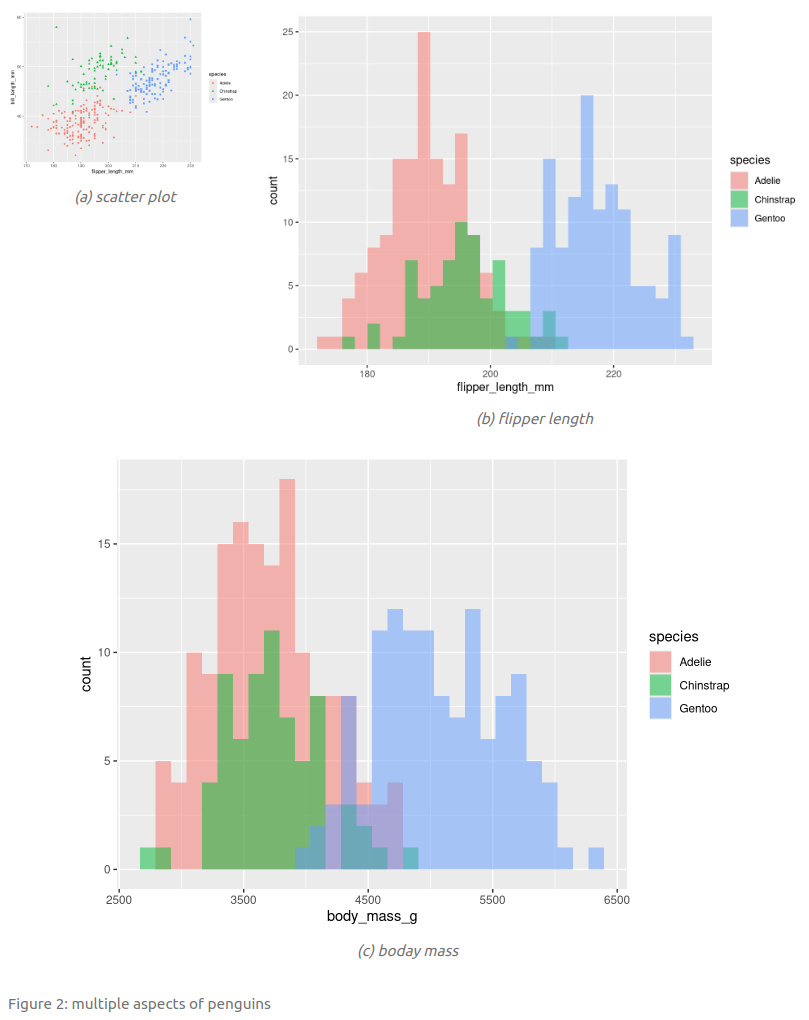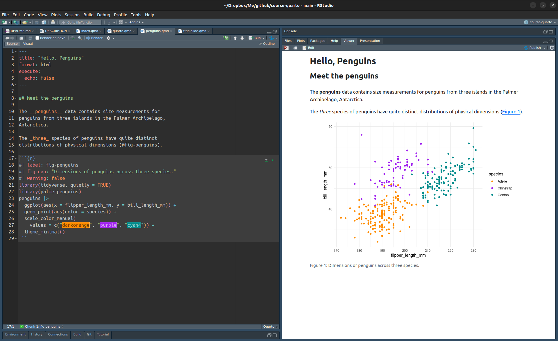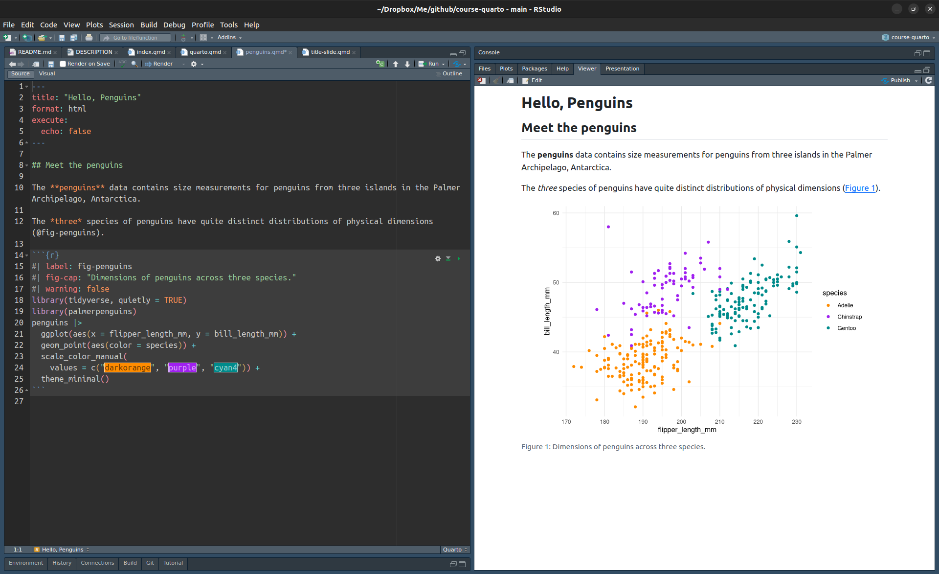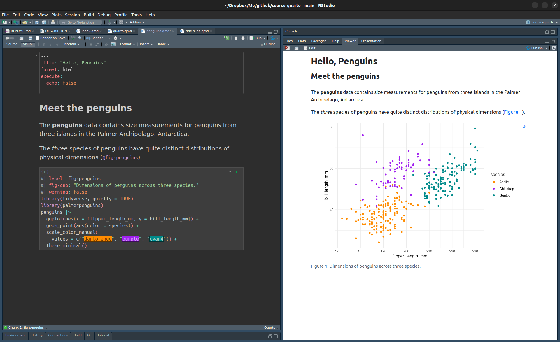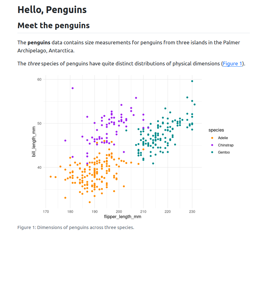 A chunk label (“fig-penguins”) has been defined, it allows referencing (and auto-numbering) the plot produced by the code as a figure anywhere in the text (@fig-penguins).