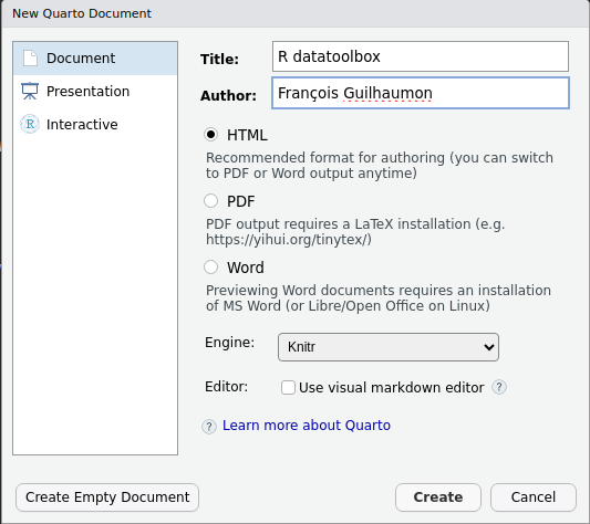 To create a new document in RStudio, go to File > New File > Quarto Document:
