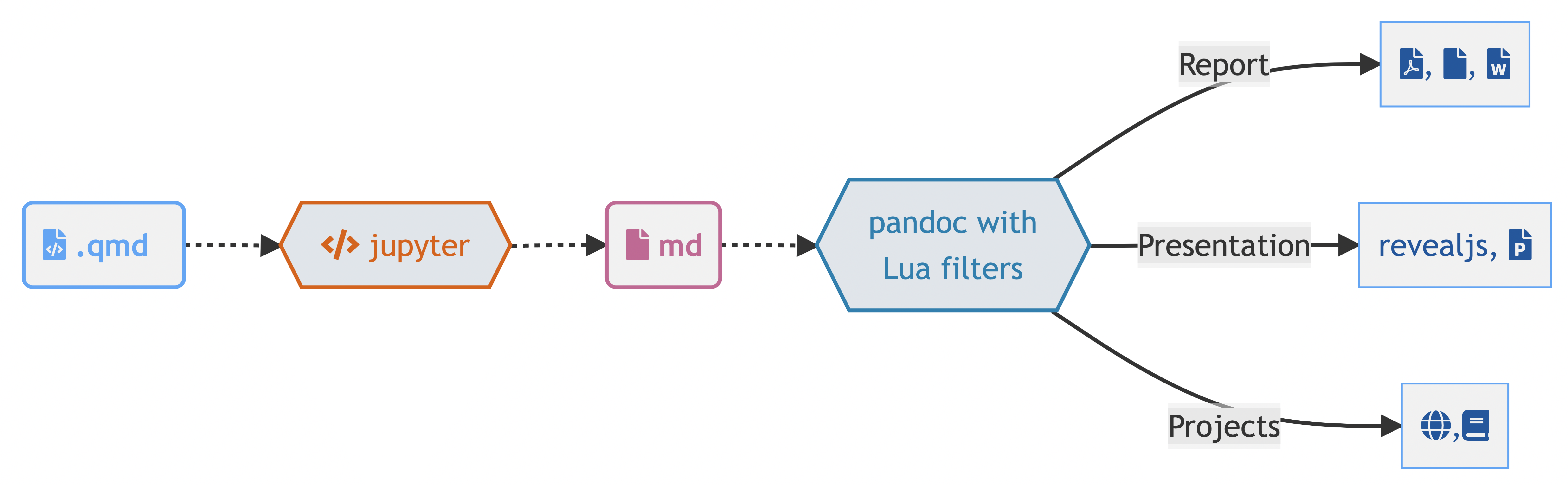 Quarto documents are fully reproducible, they automate the inclusion of the last versions of the results of an analysis, literally dozens of output formats are available: Web pages, PDFs, Word files, websites, books, and more.