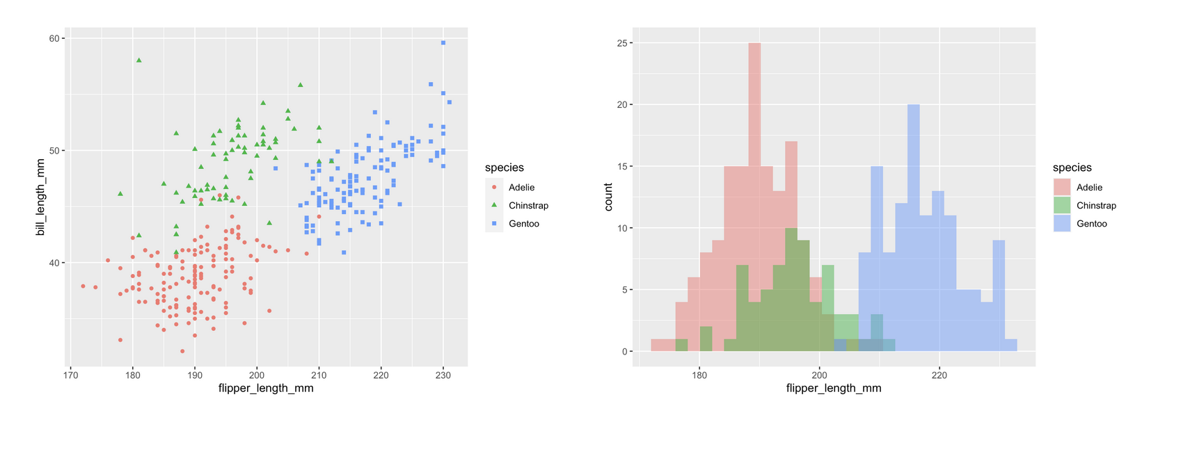 The _three_ species of penguins have quite distinct distributions of physical dimensions (@fig-penguins).````{r}#| label: fig-penguins#| fig-cap: "Dimensions of penguins across three species."#| warning: falselibrary(tidyverse, quietly = TRUE)library(palmerpenguins)penguins|>ggplot(aes(x = flipper_length_mm, y = bill_length_mm))+geom_point(aes(color = species))+scale_color_manual(values = c("darkorange","purple", "cyan4"))+theme_minimal()````