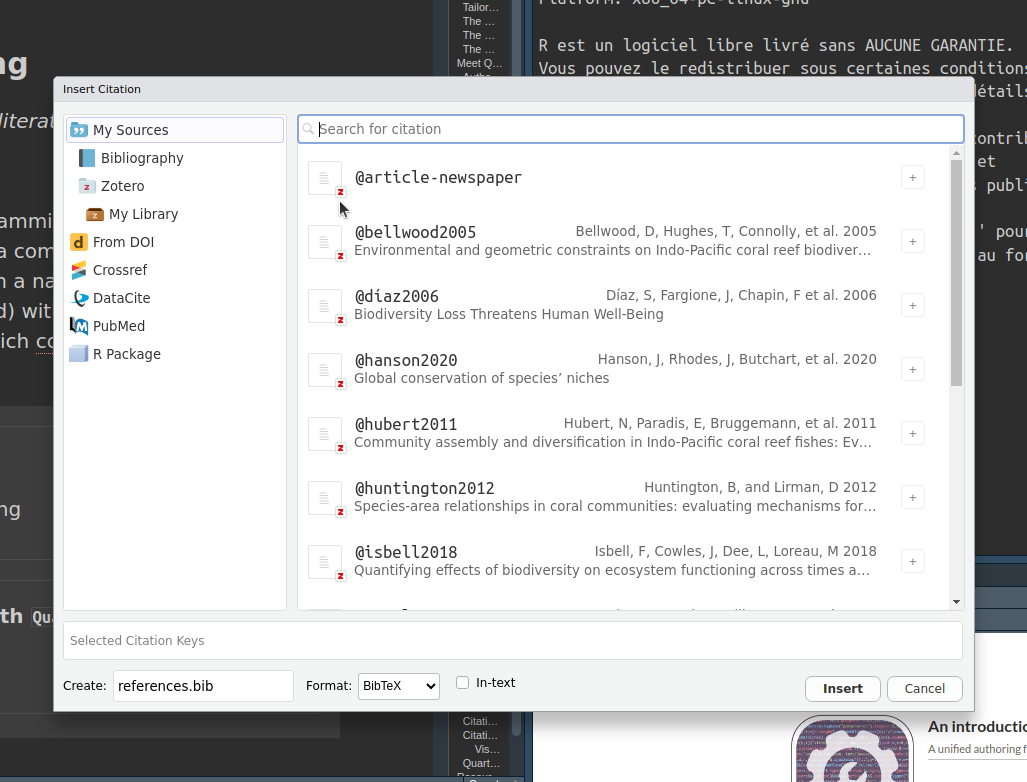 Visual mode uses the standard Pandoc markdown representation for citations (e.g. [@citation]). Citations can be inserted from a variety of sources: